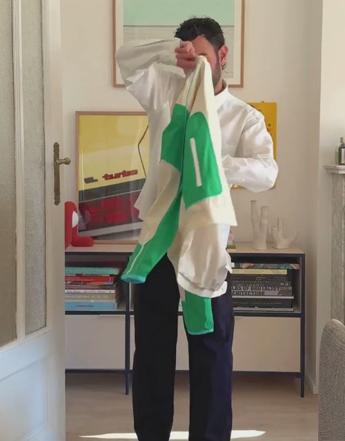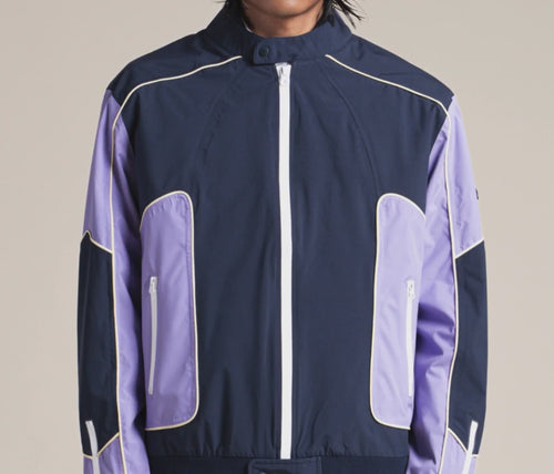 Pyramides: la biker jacket revisité: Une veste technique bicolore en noir et beige, soulignée par des détails graphiques. Une silhouette moderne qui fusionne style et fonctionnalité, parfaite pour affronter les journées pluvieuses avec caractère. Une pièce qui allie élégance et décontraction pour une allure naturellement aventurière.