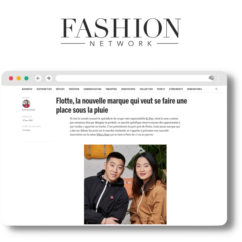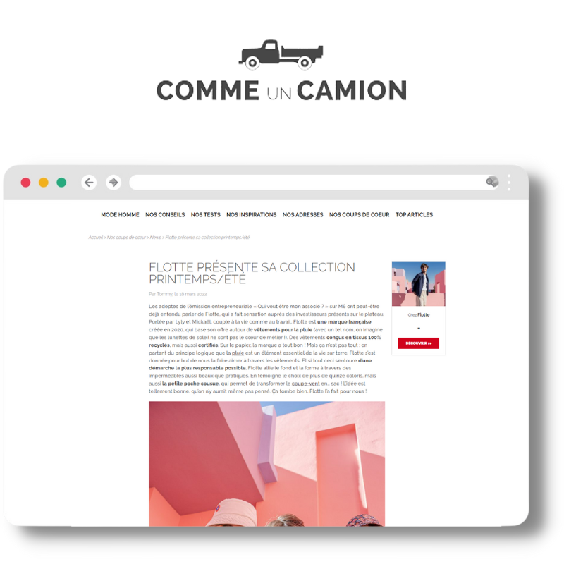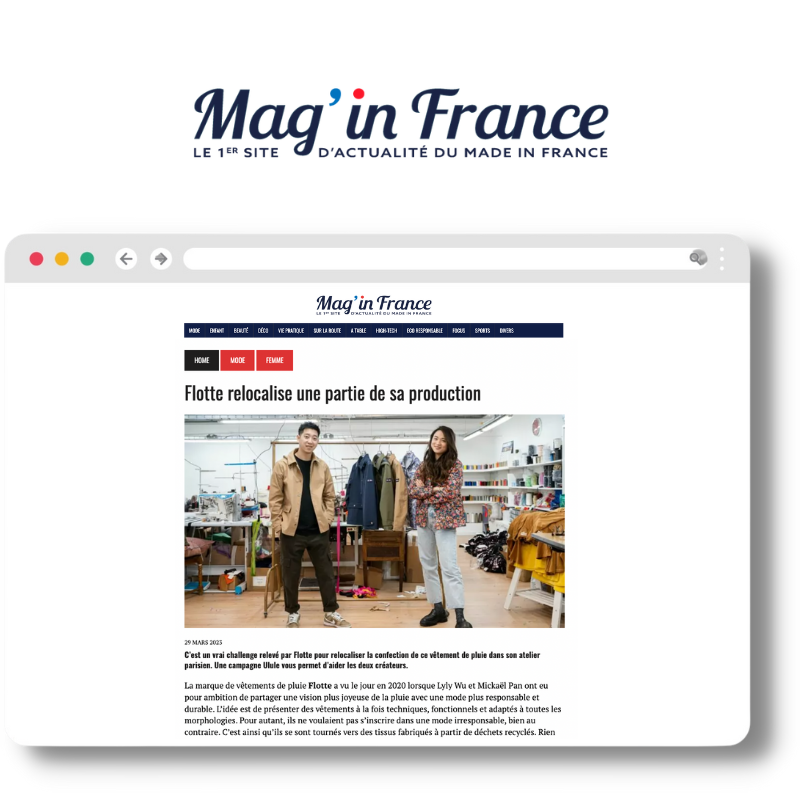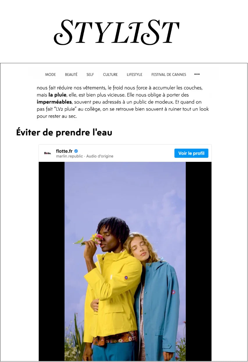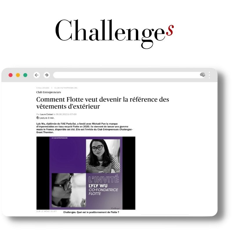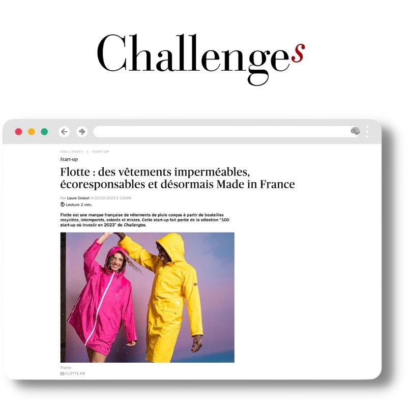 "Flotte est une marque française de vêtements de pluie conçus à partir de bouteilles recyclées, intemporels, colorés et mixtes. Cette start-up fait partie de la sélection "100 start-up où investir en 2023” de Challenges."