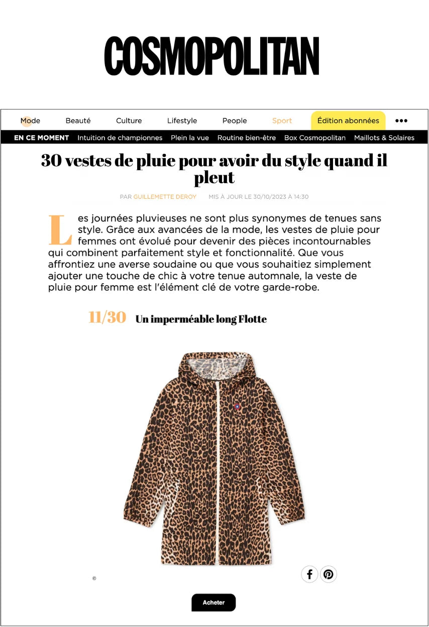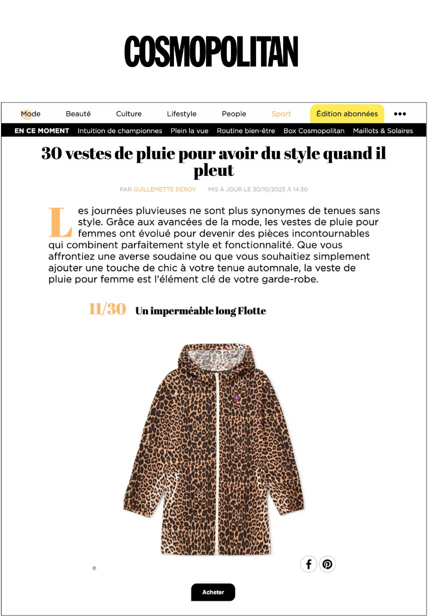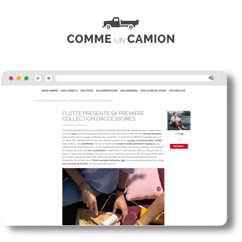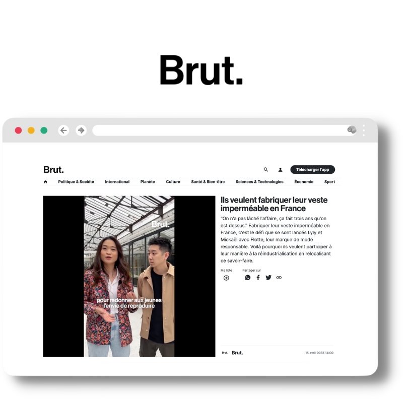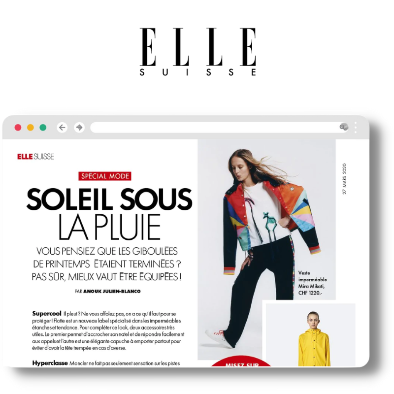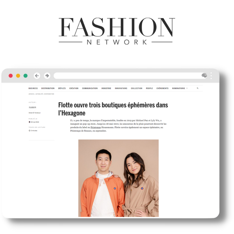 "Flotte est une marque française de vêtements de pluie conçus à partir de bouteilles recyclées, intemporels, colorés et mixtes. Cette start-up fait partie de la sélection "100 start-up où investir en 2023” de Challenges."