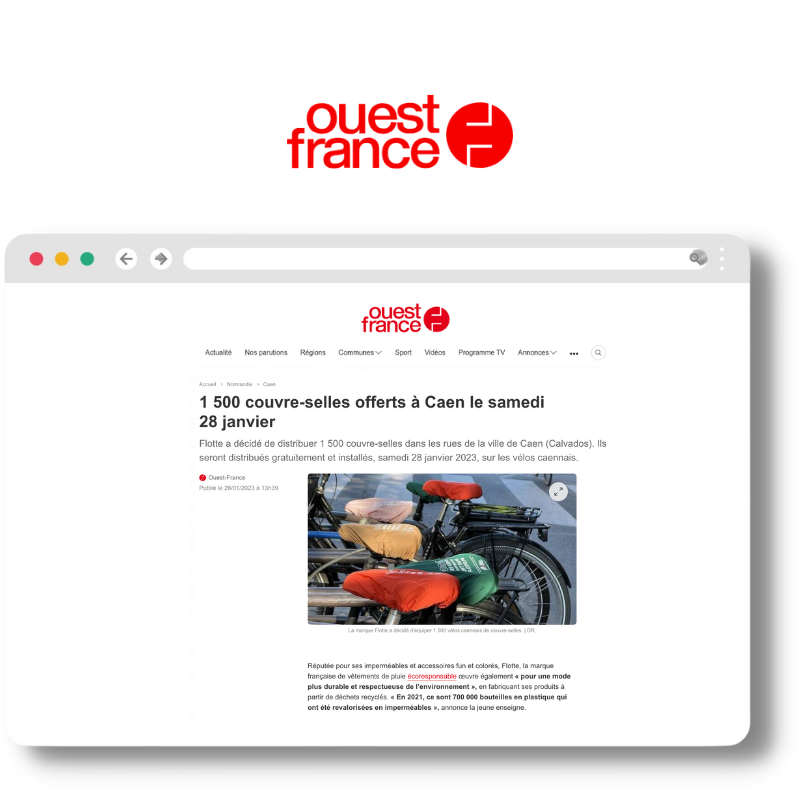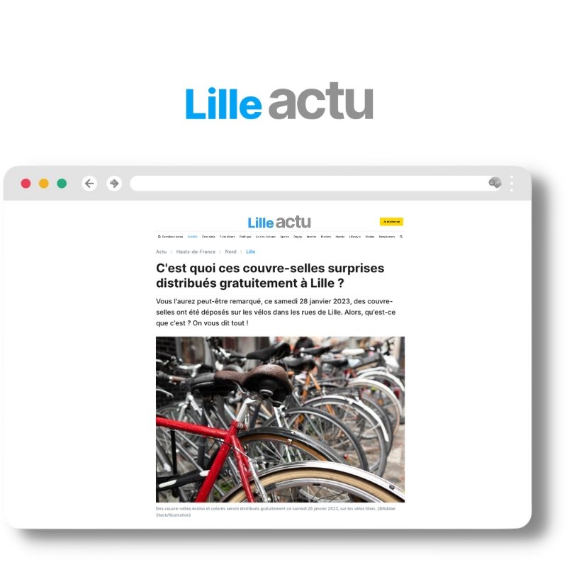 "Quoi de plus désagréable que d’enfourcher son vélo et de s’asseoir sur une selle mouillée ? Ce samedi 28 janvier 2023, les cyclistes lillois seront bien gâtés ! Une grande distribution de couvre-selles écoresponsables est organisée toute la journée, dans toute la ville, par les acteurs de la marque Flotte."